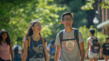 A diverse group of students are seen interacting on a college campus. The image displays natural lighting and a warm color palette. Composition includes people, trees, and buildings. Ideal for illustrating education, community, or youth-oriented content. The scene is set on a sunny day.