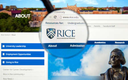 MONTREAL, CANADA - JUNE 4, 2016 : Rice University page under magnifying glass. Rice University or Rice, is a private research university located in Houston, Texas, United States.