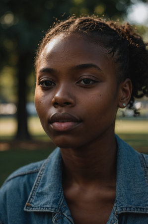 Young woman thoughtfully gazing into the distance in a park during golden hour surrounded by nature