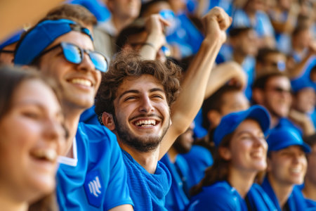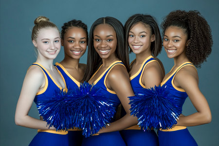 A diverse group of five cheerful cheerleaders in matching blue and gold uniforms poses with bright blue pom-poms, radiating teamwork, enthusiasm, and school spirit