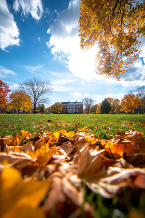 people sitting on the grass in front of an old building with columns and pillars, surrounded by autumn foliages