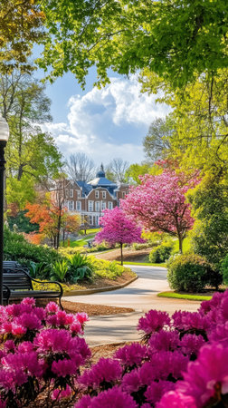Visitors enjoy a peaceful stroll in a lush park filled with blooming azaleas and vibrant trees, showing a charming historic building in the background.
