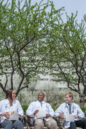 Successful team of medical doctors are looking at camera and smiling while standing in hospital