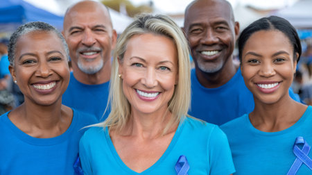 Diverse group of smiling people wearing blue shirts and ribbons for health awareness