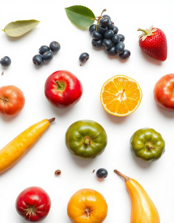 Wholesome arrangement, Fresh and vibrant fruits artfully displayed on a clean white background. A captivating concept for healthy and nutritious eating.
