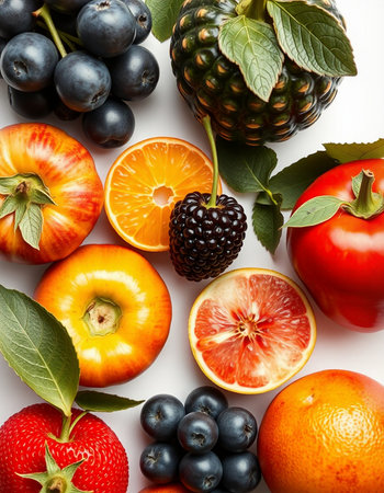 A colorful assortment of fresh fruits including oranges, berries, and pineapples, displayed in a vibrant arrangement.