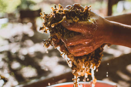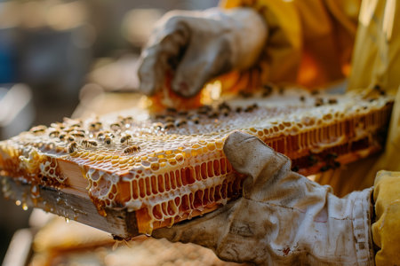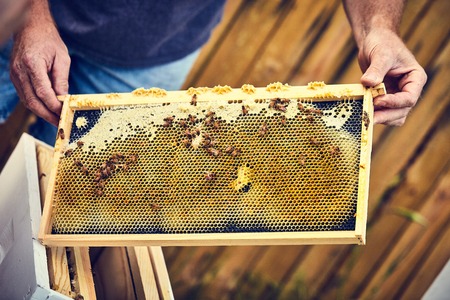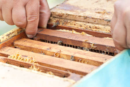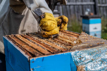 Honey beekeeper working at apiary with beeswax.