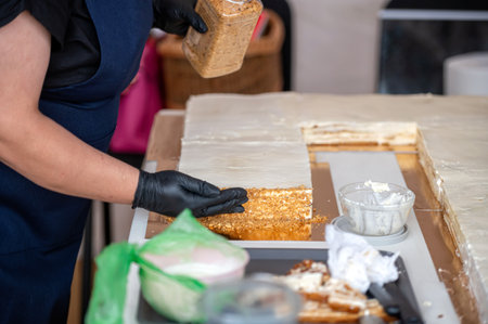 A baker assembles a large cake, placing a layer of cake on top of a spread of frosting. Shallow depth of feld