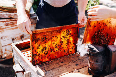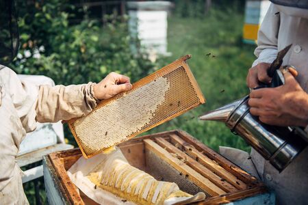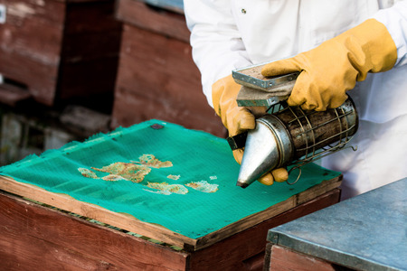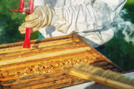 Eco apiculture and honey production business. Beekeeper fumigating bees with smoke to remove honeycombs from the apiary houses. Beepeeking process.