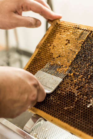 The beekeeper separates the wax from the honeycomb frame.