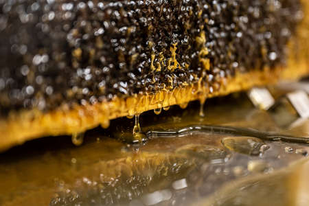 Glossy yellow golden honey comb reflection mirror sweet honey drips flow during harvest background with textspace