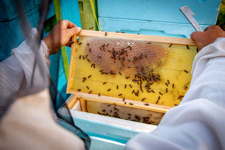 The beekeeper checks the queens for the honeycomb. Beekeepers check honey quality and honey parasites. A beekeeper works with bees and beehives in an apiary.