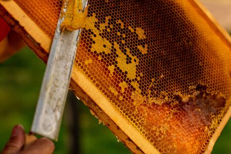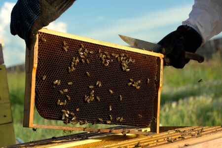 The beekeeper cuts off the honeycomb with honey. In the hand of a knife in wax and liquid sweet honey. The bowl contains a honeycomb with nectar. The celebration of the national day of the honey bee.