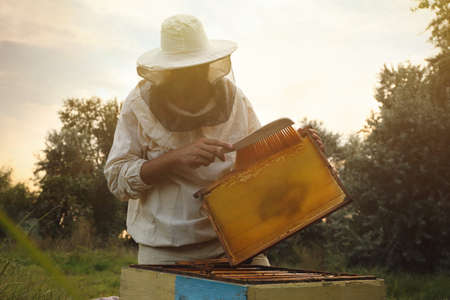 Beekeeper in uniform with honey frame at apiary