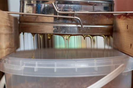 Natural raw honey being filtered ad dripped through a strainer to filter our bees wax.