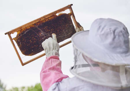 Closeup of beekeeper holding a honeycomb. Beekeeper in protective workwear inspecting honeycomb frame at apiary. Beekeeping concept. Farmer harvesting honey.