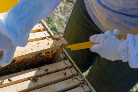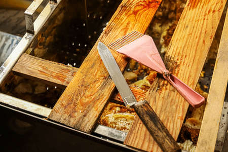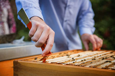 Hand using a scraper to clog honeycombs with honey in a frame. Beekeeper Unseal Honeycomb.