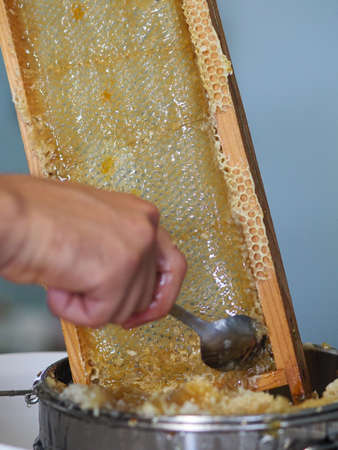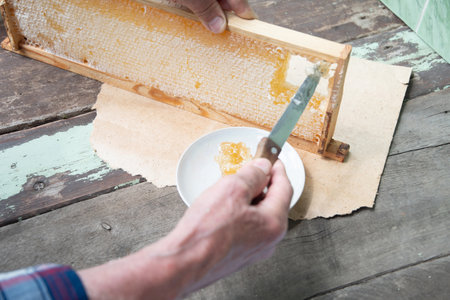 Close up of beekeeper hands cuts wax from honeycomb frame with a special knife into a bowl. Honey production.