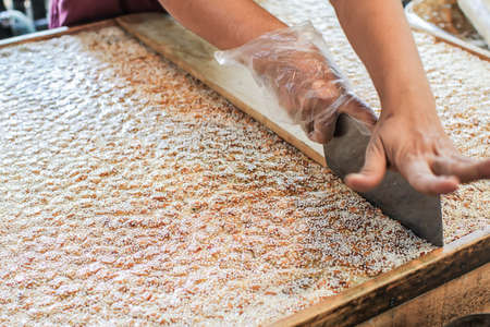 Traditional Thai's sweet cereal bar. Homemade Peanut Biscuits made from peanuts, white sesame seeds, crispy rice, coconut milk and palm sugar mixed all and cut pieces by pieces on wooden box.