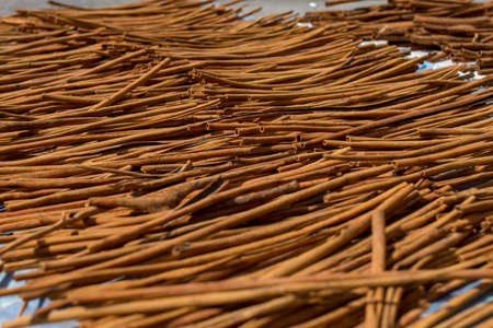 Fresh Cinnamon sticks out in the street drying in the midday sun. Low angle depth of field shot.