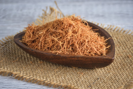 Good herbs for immunity. Cat's claw on a wooden bowl.