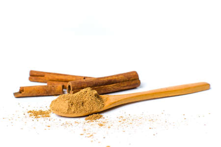 Cinnamon powder in a spoon and sticks isolated