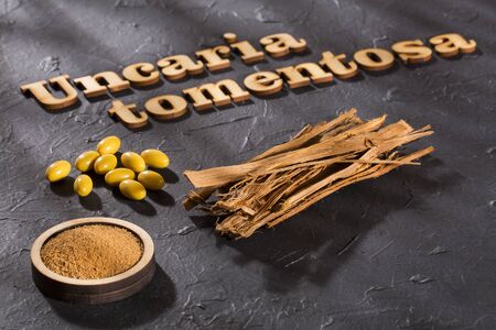 Uncaria tomentosa bark on wooden table - Amazon climbing plant
