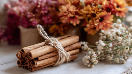 Cinnamon sticks wrapped in twine next to dried flowers in a cozy indoor setting