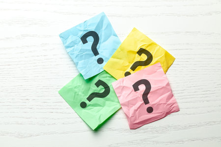 colorful paper with question mark in a plastic jar on wooden table. questions and diversity concept. FAQ and Q&A background concept