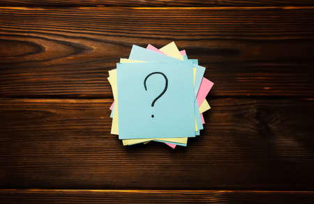 Stack of Paper stickers with a question mark on a wooden background, concept for solving the problem.