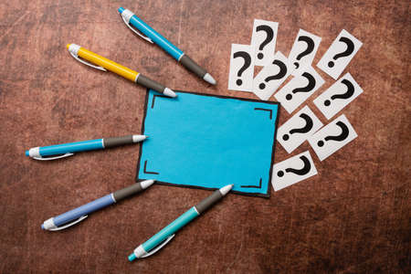 a question mark on a white sheet. FAQ frequency asked questions, Answer and Brainstorming Concepts