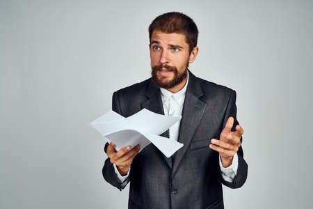 Caucasian businessman sitting having video chat going through paperwork in modern office. business modern office workplace technology.