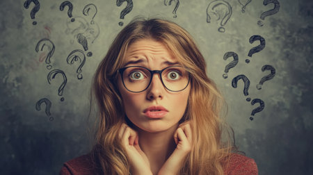 A young woman with glasses looks confused while holding her face, contemplating life's uncertainties with colorful question marks in the background.