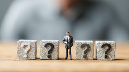 A figurine stands next to blocks marked with question marks on a wooden surface, symbolizing business decisions and uncertainty faced in choices.