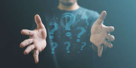 Man is thinking, question marks, brainstorming and looking for answers, solving a problem, making a decision, business and education concept