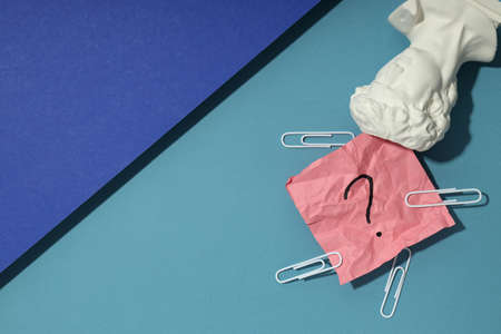 Memo piece of paper with drawn question marks on colored background. Top view. Minimalism