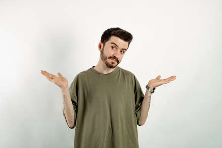 Handsome caucasian man wearing khaki t-shirt posing isolated over white background shrugs his shoulders, looks puzzled, spread hands sideways, don't know, cant tell, stands