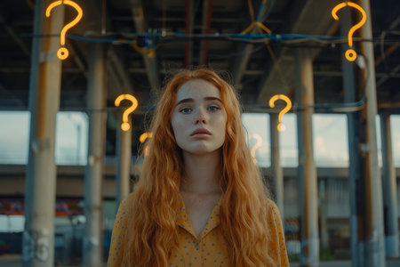 A young woman appears puzzled, contemplating her thoughts as she stands amid large question marks, creating an inquisitive atmosphere.