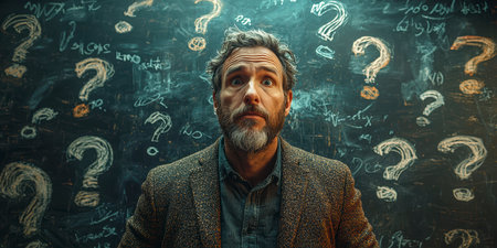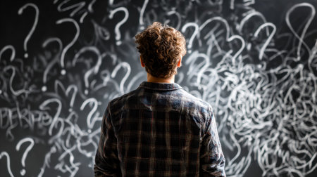Concept illustration of a person at a blackboard with question marks, symbolizing confusion, decision making, and searching for answers