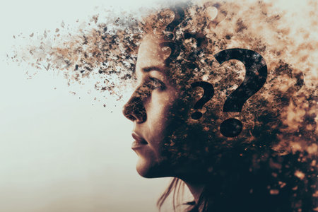 Profile of woman with question marks disintegrating into dust cloud, deep thoughts and confusion.