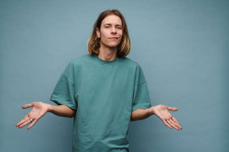 Man with an innocent expression on face spreads arms to the sides and looks at the camera in bewilderment. Blue background.