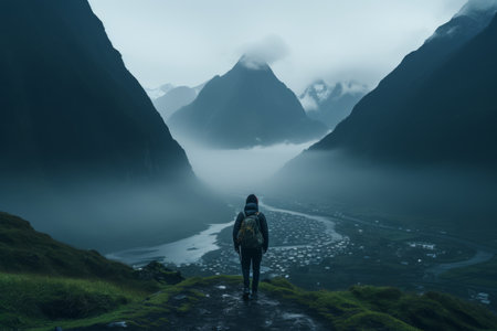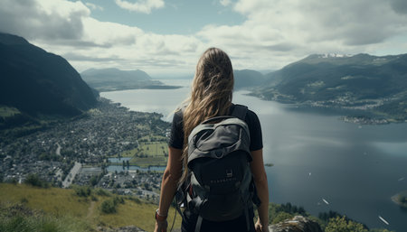 Hiker marveling at majestic mountain view with backpack, embracing breathtaking valley scenery