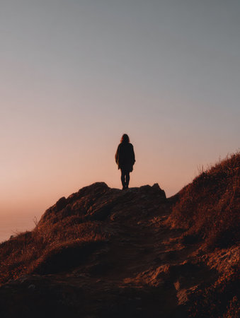 A person walks alone on a rocky trail during sunset, surrounded by soft hues of orange and pink in the sky, exuding a peaceful atmosphere.
