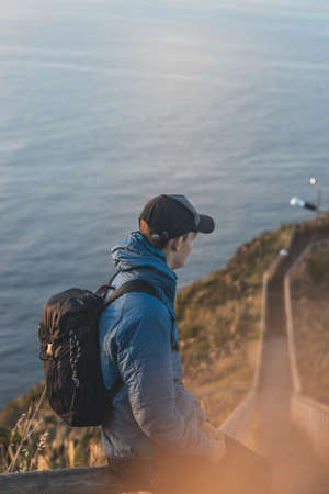 Student wearing a jacket enjoys the view from Cristo Rei, Camara de Lomos, Madeira belonging to Portugal. Sunrise on the Atlantic coast. Discovering the European continent.