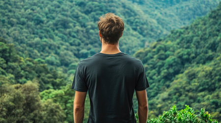 Man wearing a plain black t-shirt, back view, standing before a picturesque mountain forest with vibrant green foliage.