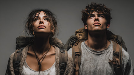 A dynamic duo stands poised for adventure, embodying the spirit of exploration with their hiking gear and eager expressions. Ideal for travel themes.