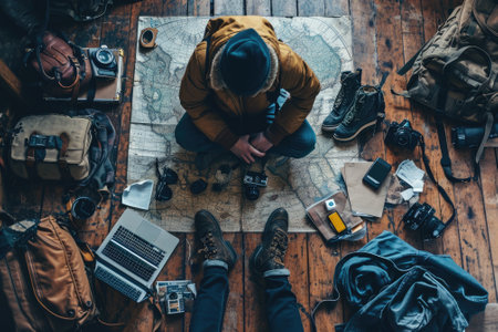 An individuals hand is seen holding a classic black camera over a map, capturing the essence of travel and exploration with a steaming cup of coffee nearby. AI generation