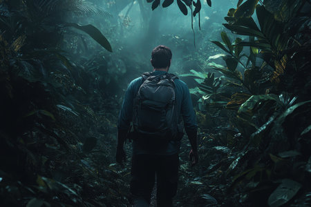 A hiker ventures into a vibrant tropical forest at dawn, surrounded by rich foliage and a serene atmosphere, with soft mist enveloping the landscape.