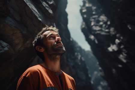 A man wearing an orange shirt gazes up at the sky. This image can be used to depict curiosity, wonder, or a sense of awesome.
