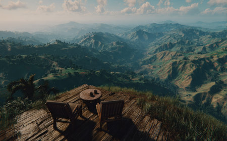 Two chairs and a small table are arranged on a wooden platform overlooking a vast mountain range. The scene is bathed in a soft, diffused light, suggesting a daytime setting. The composition features rich greens and blues. The image is suitable for travel, tourism, and environmental projects.